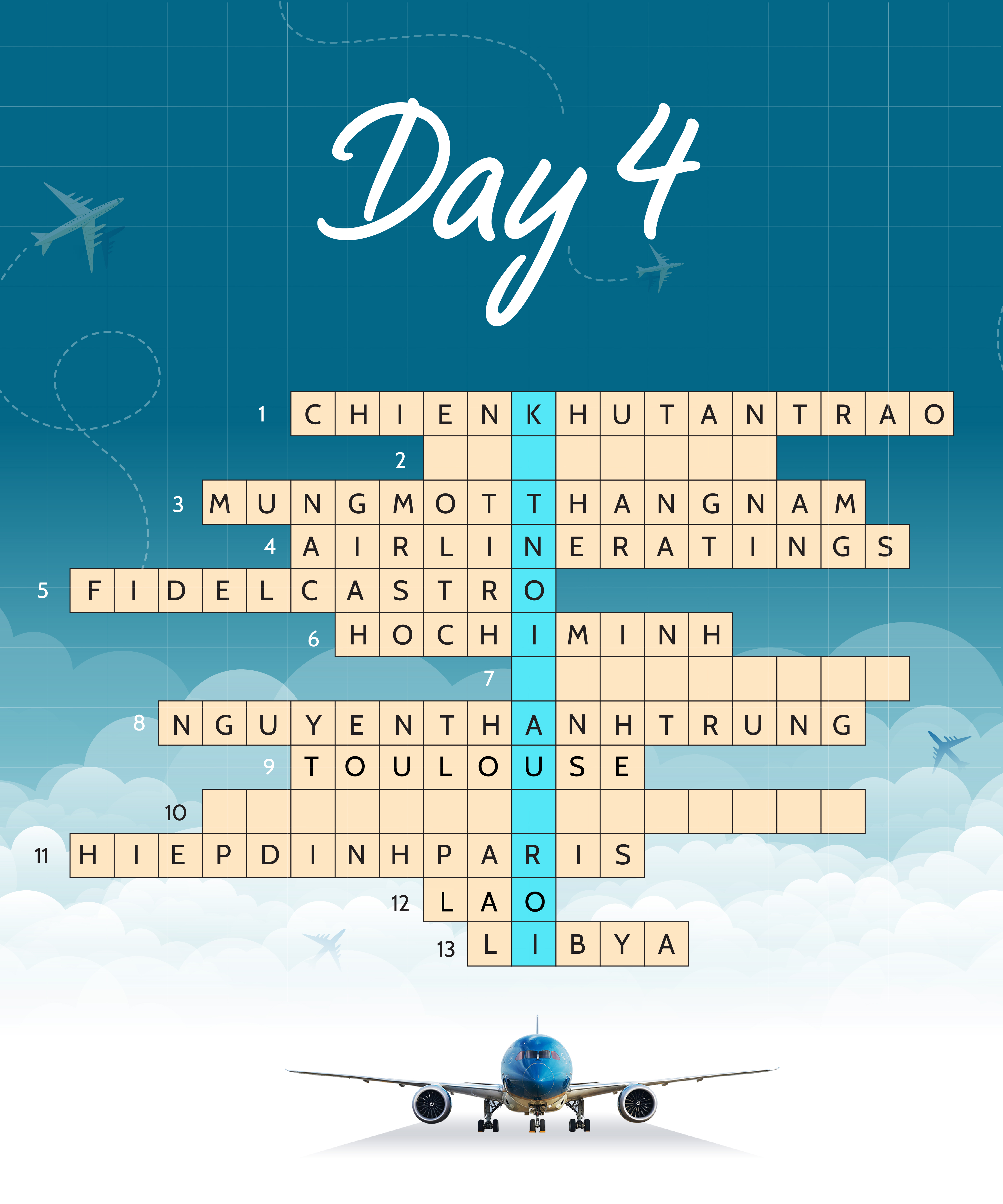 Giải chính dành cho 05 CBNV trả lời chính xác và nhanh nhất từ khóa hàng dọc và gửi qua email truyenthongnoibo@vietnamairlines.com trước 08h00 ngày 26/4/2024 (BTC chỉ nhận câu trả lời cho từ khóa hàng dọc qua email).