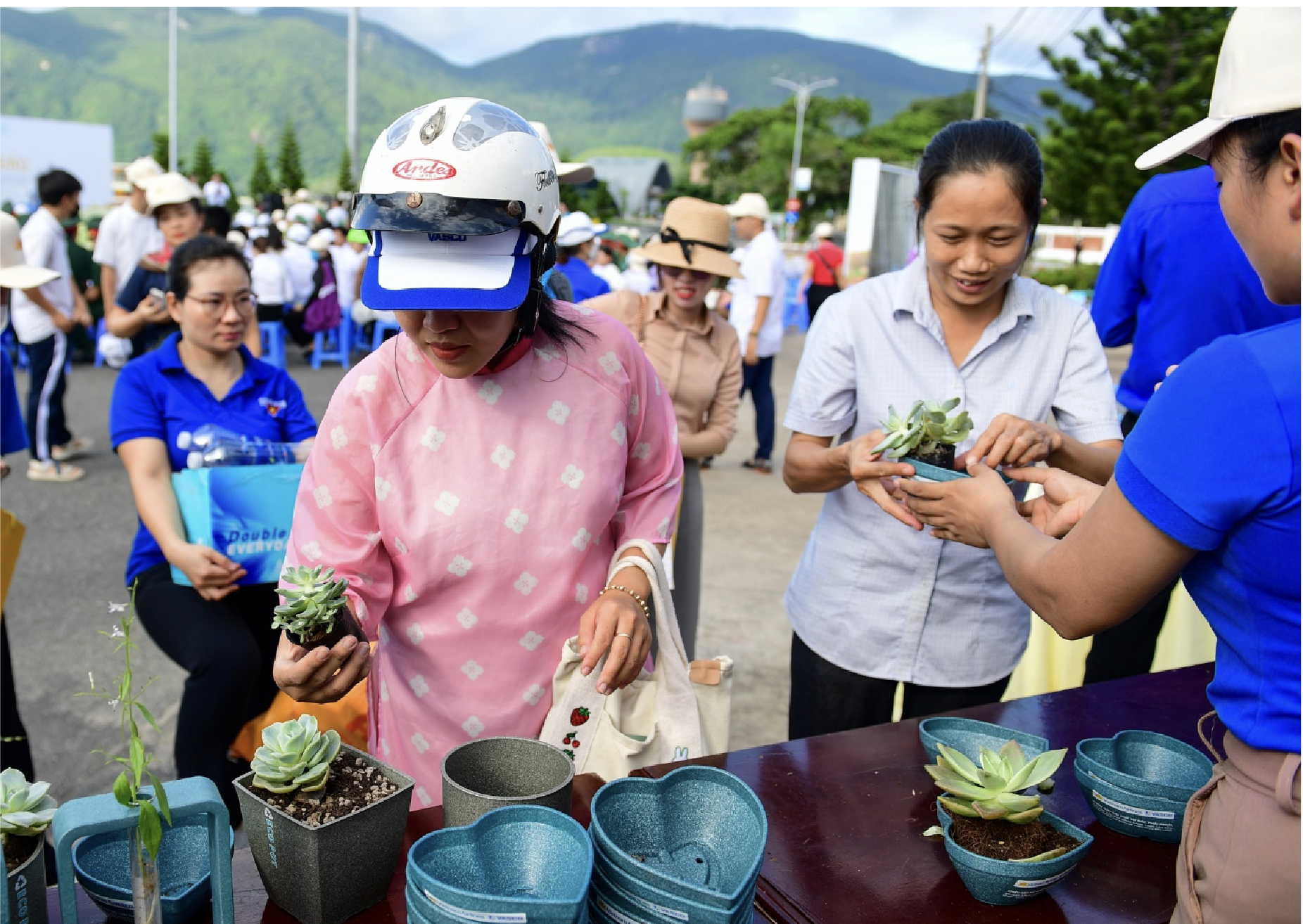 Nhiều người dân Côn Đảo dậy từ tinh mơ, mang theo rác thải nhựa tới để đổi cây xanh trong ngày chiến dịch “Bay nhẹ tới Côn Đảo” của Vietnam Airlines group.