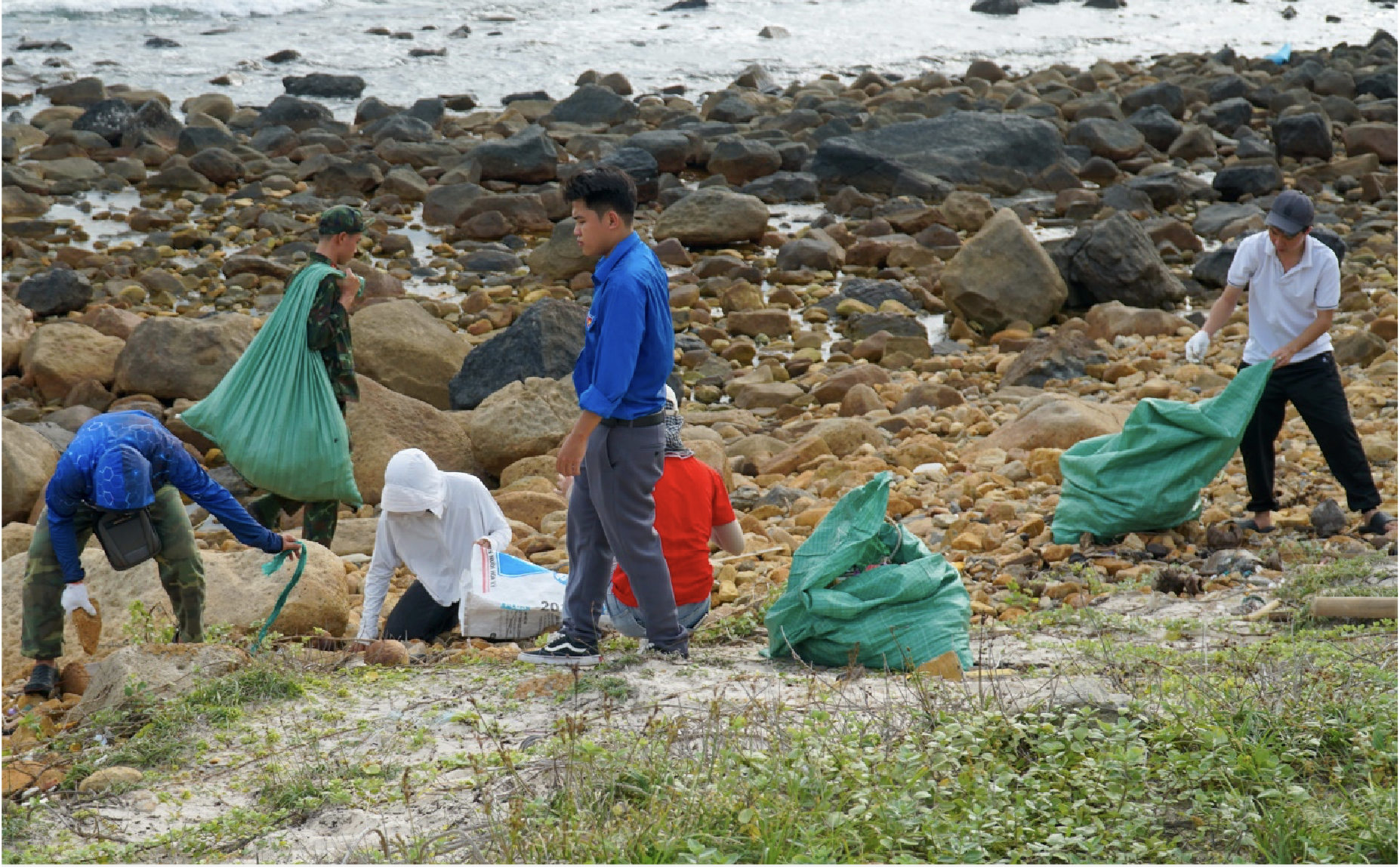 Từ sớm, người dân trên đảo đã có mặt, mang theo những túi rác thải nhựa để thu gom.