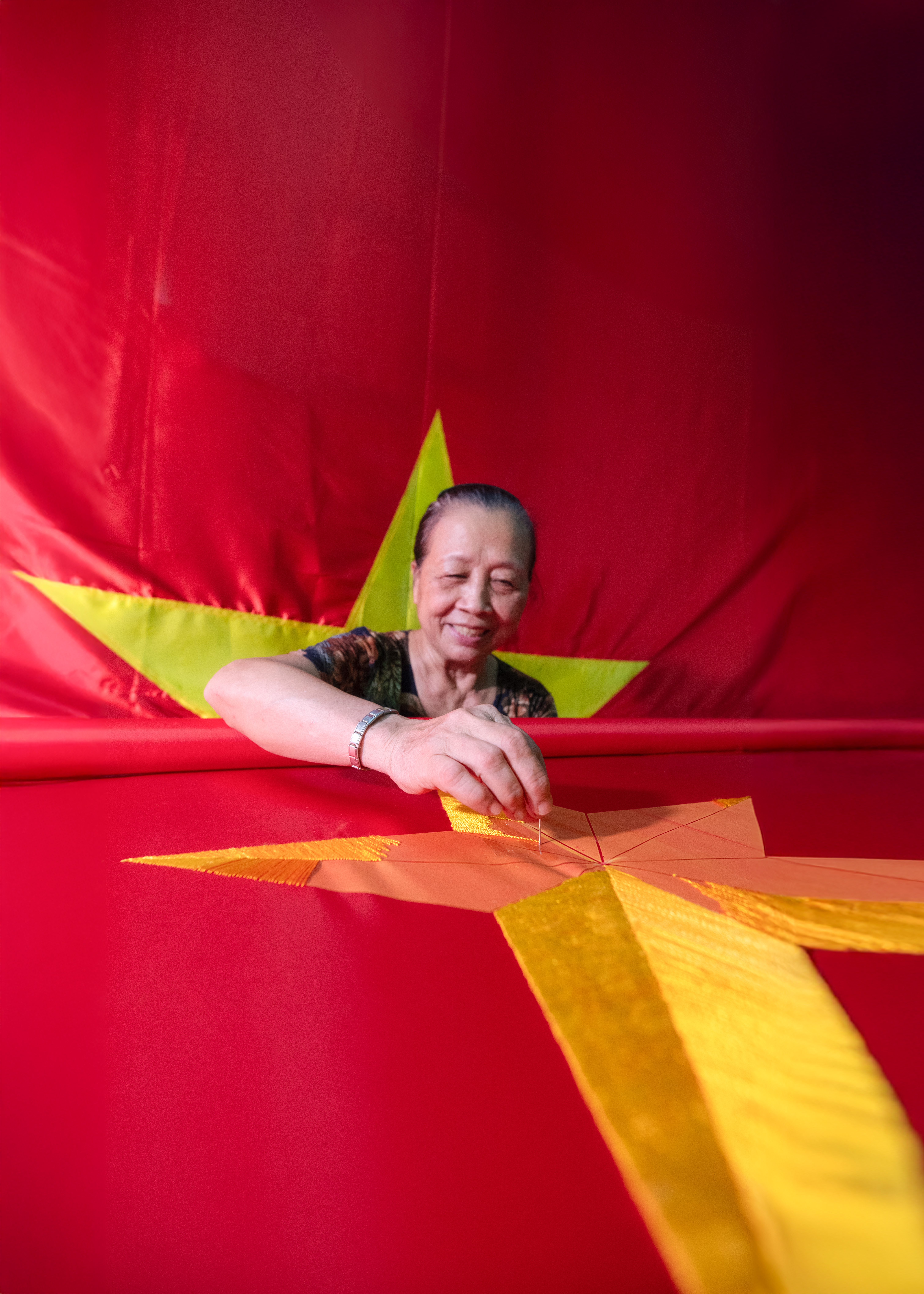 Nếu trước đây mọi khâu đều làm thủ công thì hiện nay, nhiều công đoạn có máy móc, công nghệ trợ giúp nên độ sắc nét, kích thước hay tỷ lệ ngôi sao vàng và lá cờ đỏ luôn chuẩn xác. Đó là đối với những sản phẩm đại trà, còn những sản phẩm thêu tay sao vàng thì đòi hỏi sự tỉ mỉ, tâm huyết từ người thợ. Theo chị Vương Thị Nhung, chủ một xưởng lớn ở Từ Vân, những người thêu đẹp và nhanh cũng phải mất 2 ngày dành trọn công sức cho từng đường kim, mũi chỉ. Những người mới học việc hay đang làm quen dần thì cần đến cả tuần mới cho ra được sản phẩm ưng ý.