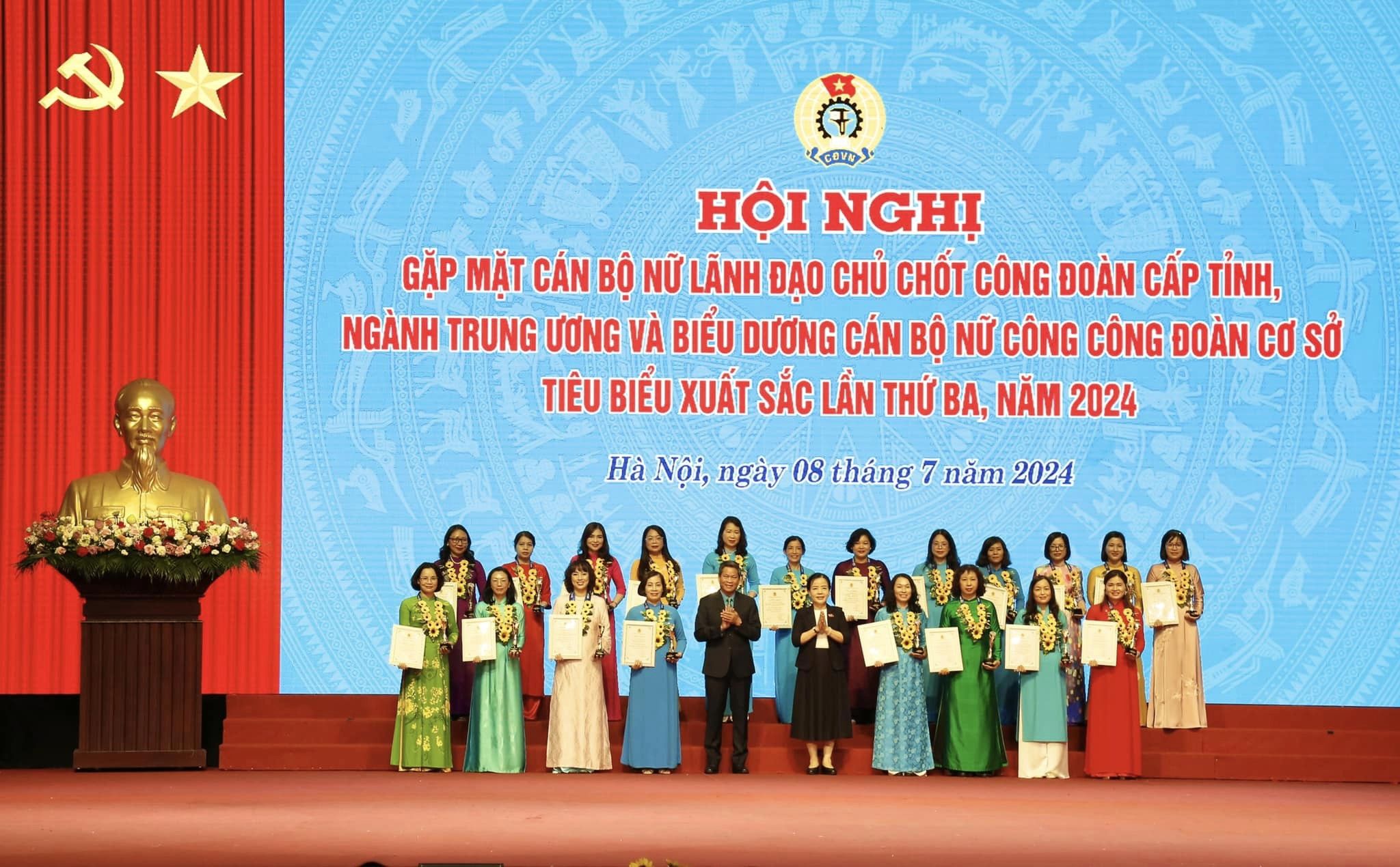 Chiều ngày 8/7, Tổng Liên đoàn Lao động Việt Nam (TLĐ) đã tổ chức Hội nghị gặp mặt cán bộ nữ lãnh đạo chủ chốt công đoàn cấp tỉnh, ngành Trung ương và biểu dương cán bộ nữ công công đoàn cơ sở (CĐCS) tiêu biểu xuất sắc lần thứ 3, năm 2024 tại Hà Nội.