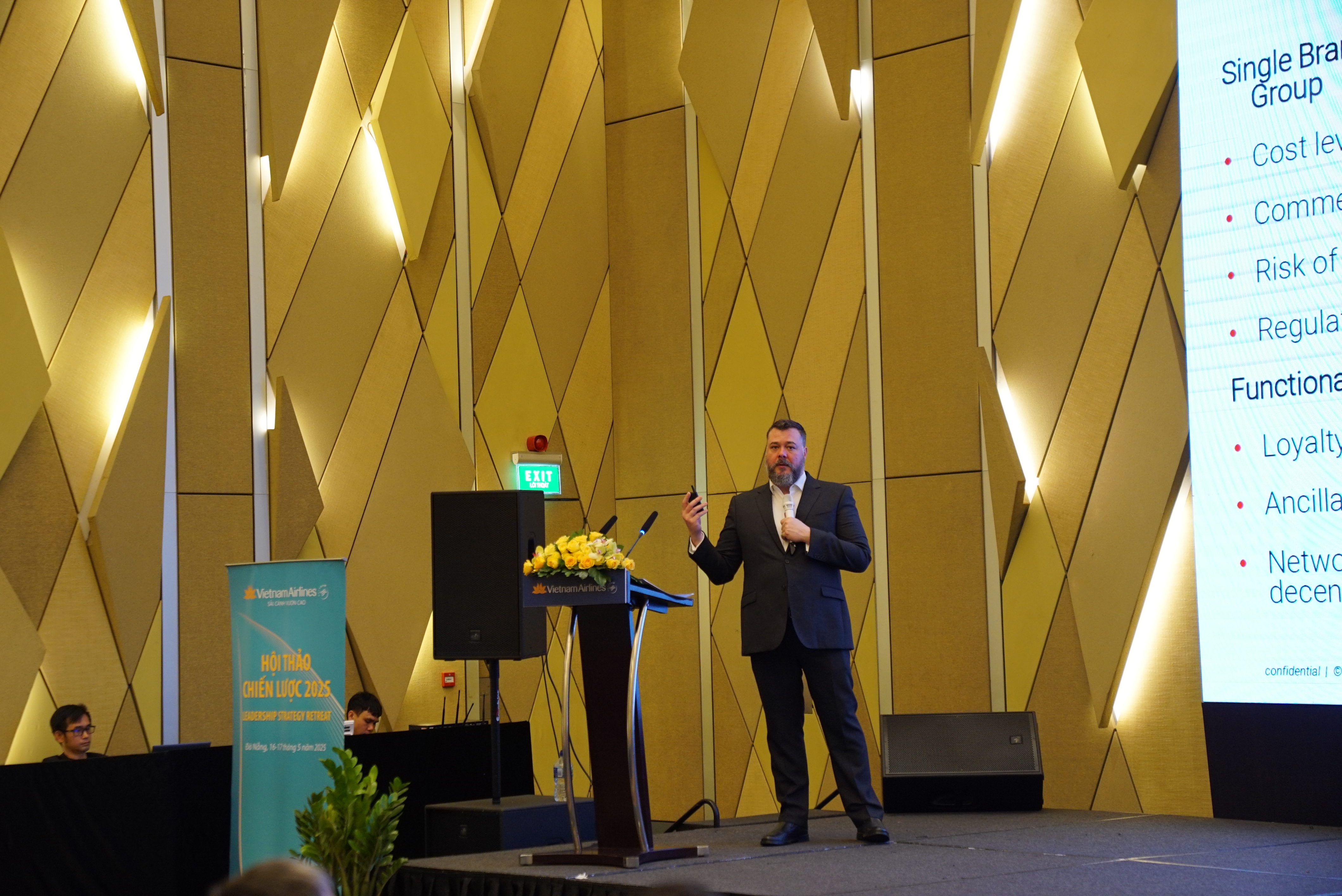 Bên cạnh các báo cáo nội bộ, hội thảo cũng lắng nghe những chia sẻ chuyên sâu từ các đối tác quốc tế. Đại diện Sabre đã trình bày tổng quan về mô hình hoạt động và tổ chức quản trị của các Airlines Group trên thế giới, mang lại góc nhìn thực tiễn trong việc vận hành hiệu quả mô hình đa thương hiệu. Trong khi đó, đại diện Airbus cung cấp phân tích cập nhật về xu hướng phát triển thị trường hàng không toàn cầu và khu vực giai đoạn sắp tới.