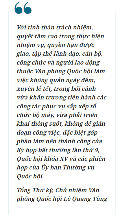 Cụ thể là, các cơ quan của Quốc hội, Văn phòng Quốc hội đã tham mưu hoàn thành khối lượng công việc rất lớn tại Kỳ họp bất thường lần thứ 9 với nhiều quyết định có tính lịch sử.
