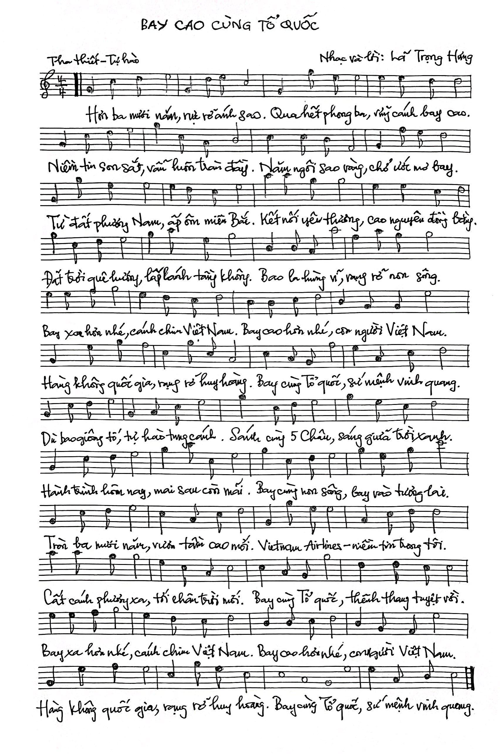 Giai điệu bay bổng, hùng tráng hòa quyện cùng ca từ đầy cảm xúc, bài hát không chỉ là lời tri ân dành cho những thế hệ đã góp phần xây dựng Vietnam Airlines, mà còn là tiếng lòng chung của những con người vẫn ngày đêm lặng thầm phía sau mỗi chuyến bay, để hành trình không chỉ an toàn, mà còn trọn vẹn sự tự hào và khát vọng. Bay Cao Cùng Tổ Quốc không chỉ là một bản nhạc, mà còn là một biểu tượng của tinh thần không ngừng vươn cao, vươn xa của những đôi cánh mang hồn Việt.