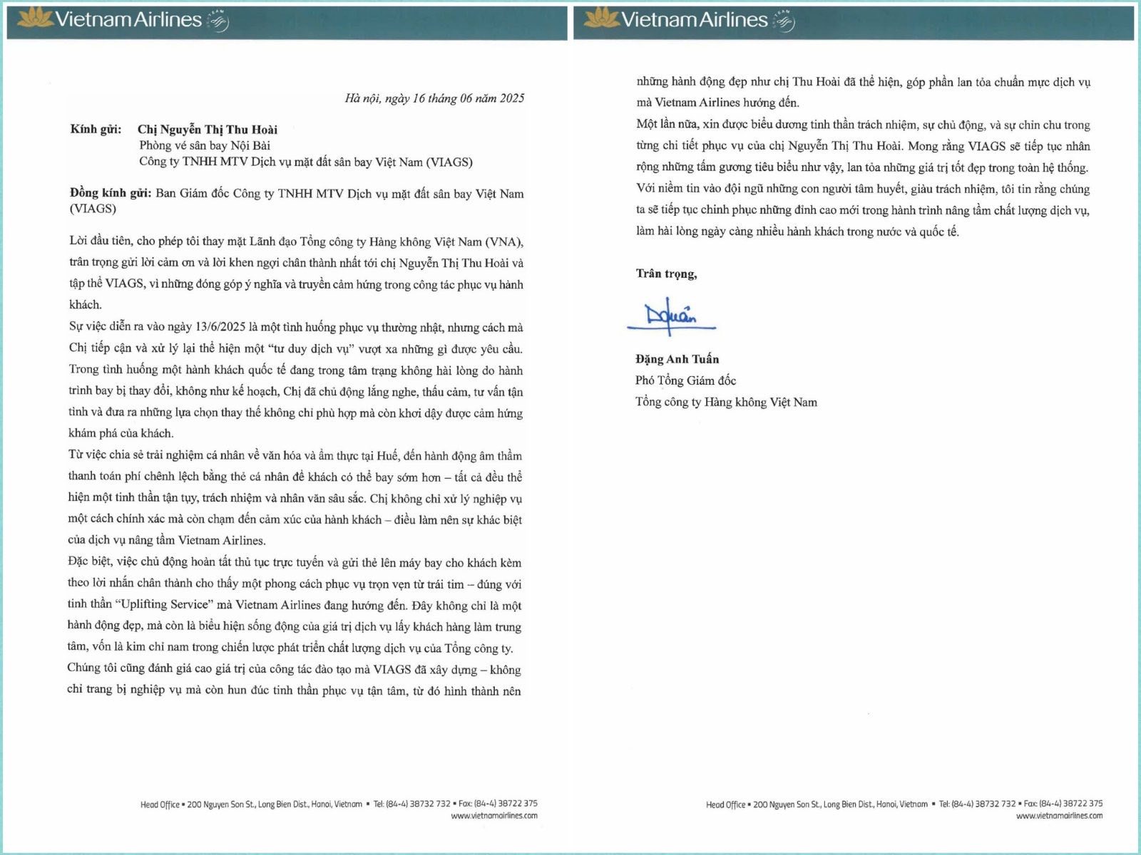 Xin cảm ơn chị Thu Hoài. Chúc chị luôn giữ lửa nhiệt huyết yêu nghề, vững tin, gắn bó, góp phần lan tỏa chuẩn mực dịch vụ mà VNA và VIAGS hướng tới.