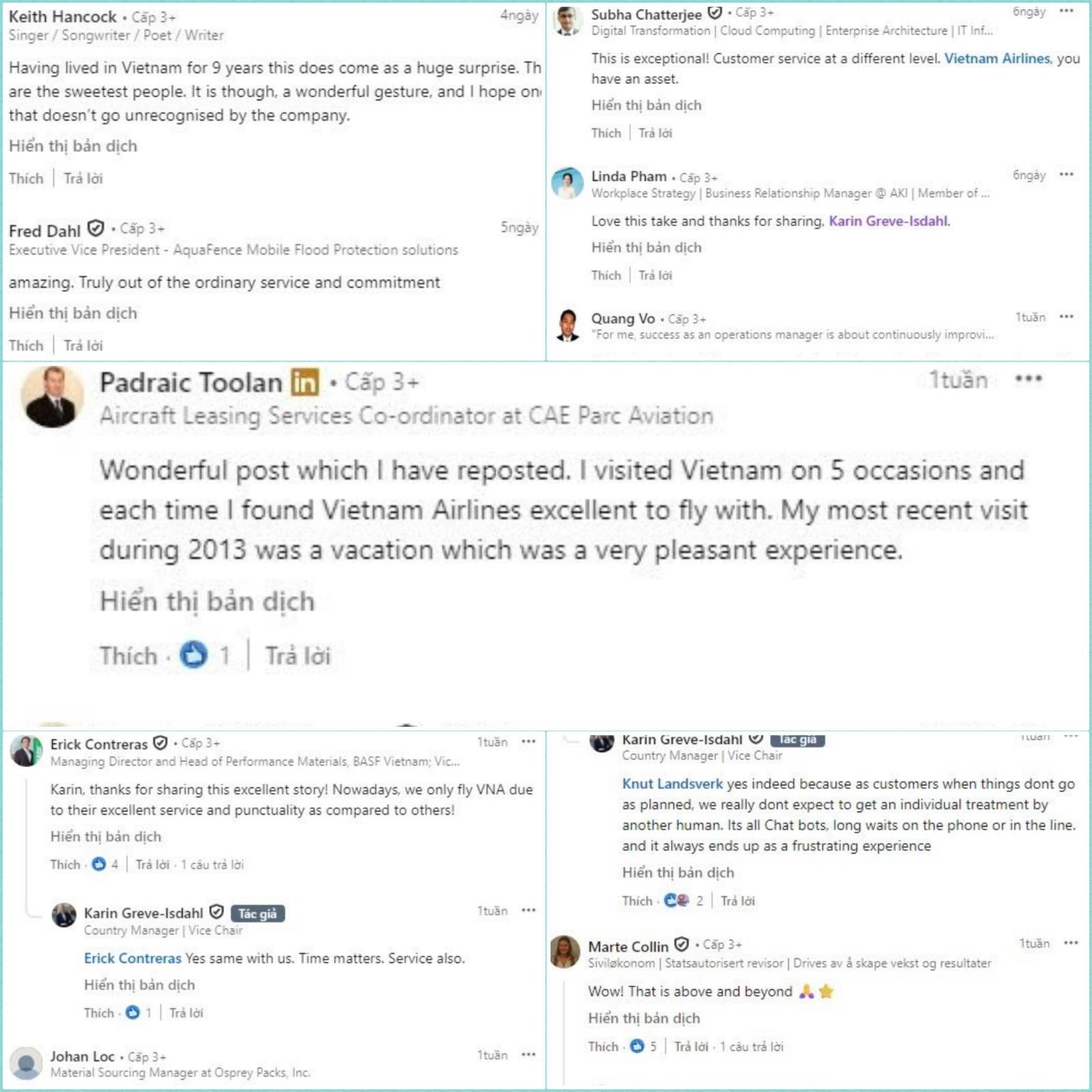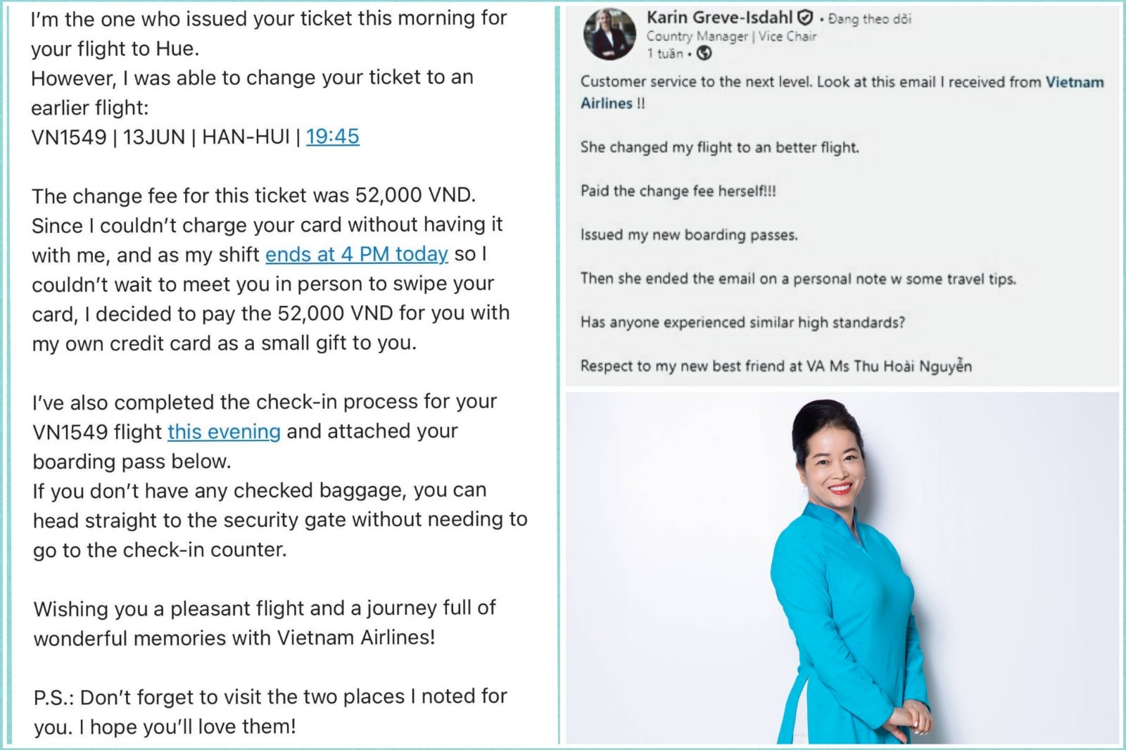 Tôi rất bất ngờ khi câu chuyện được hành khách Karin Greve-Isdahl chia sẻ trên Linkedin lại được quan tâm và có sức lan tỏa đến vậy. Khi nhận được Thư khen gửi trực tiếp từ PTGĐ VNA Đặng Anh Tuấn ngày 16/6 tôi vô cùng xúc động.