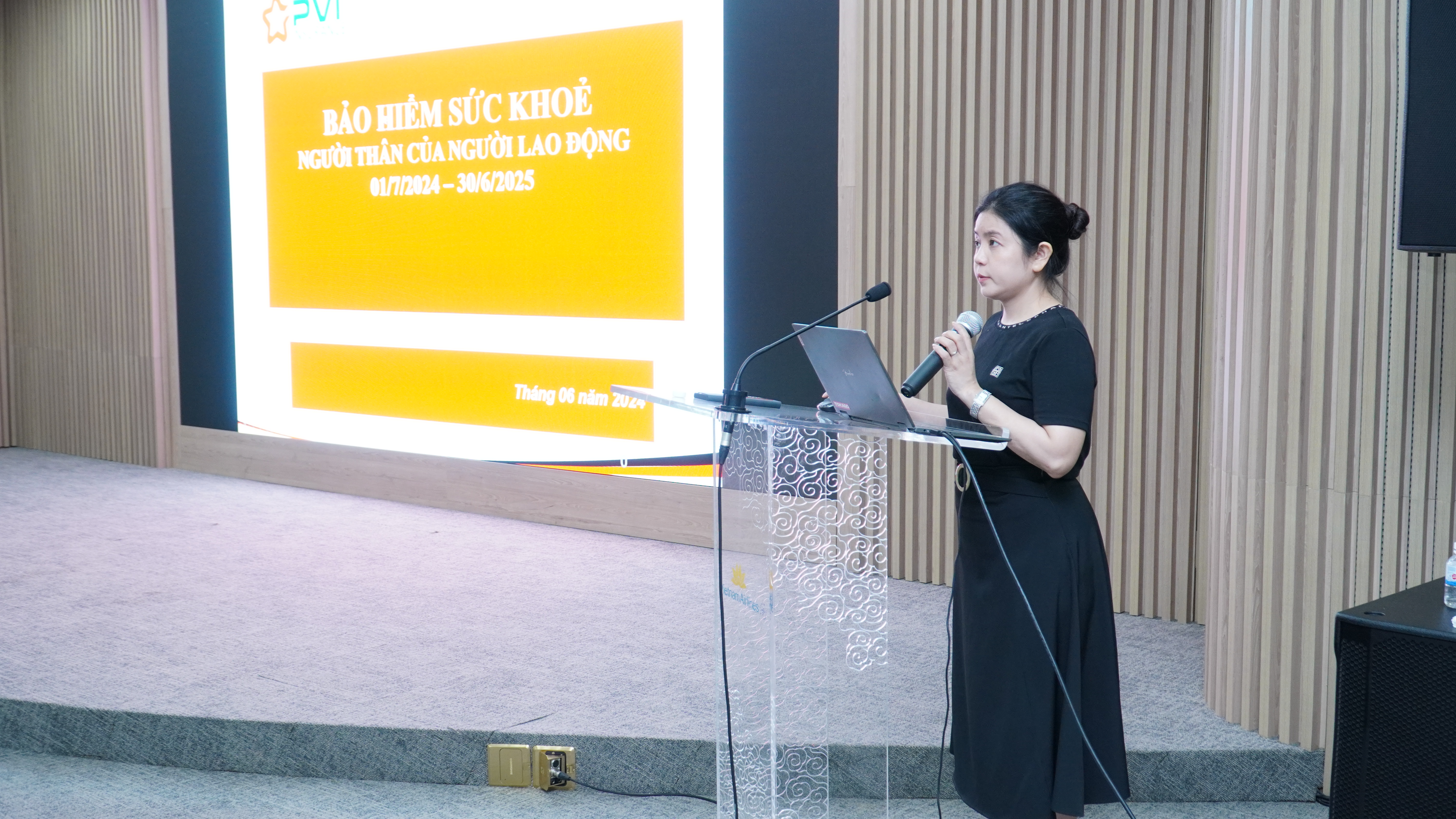 Chị Phạm Thu Mai – Đại diện Ban Pháp chế giới thiệu về nội dung Tọa đàm, giới thiệu về bảo hiểm PVI và chương trình bảo hiểm sức khỏe cho NLĐ giai đoạn 2024 – 2025.