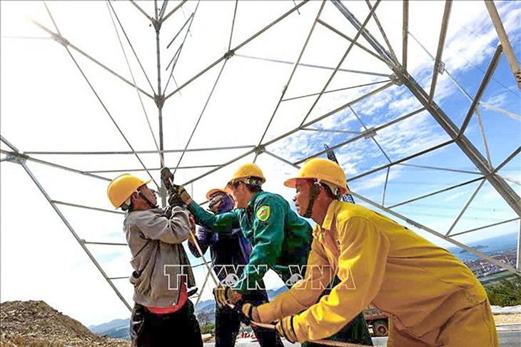 Nỗ lực cao độ của những công nhân ngành điện, thi công liên tục ngày đêm để đảm bảo tiến độ, cán đích đúng hẹn dự án đường dây tải điện siêu cao áp 500kV mạch 3 theo đúng yêu cầu của Thủ tướng Chính phủ. (Ảnh: TTXVN)