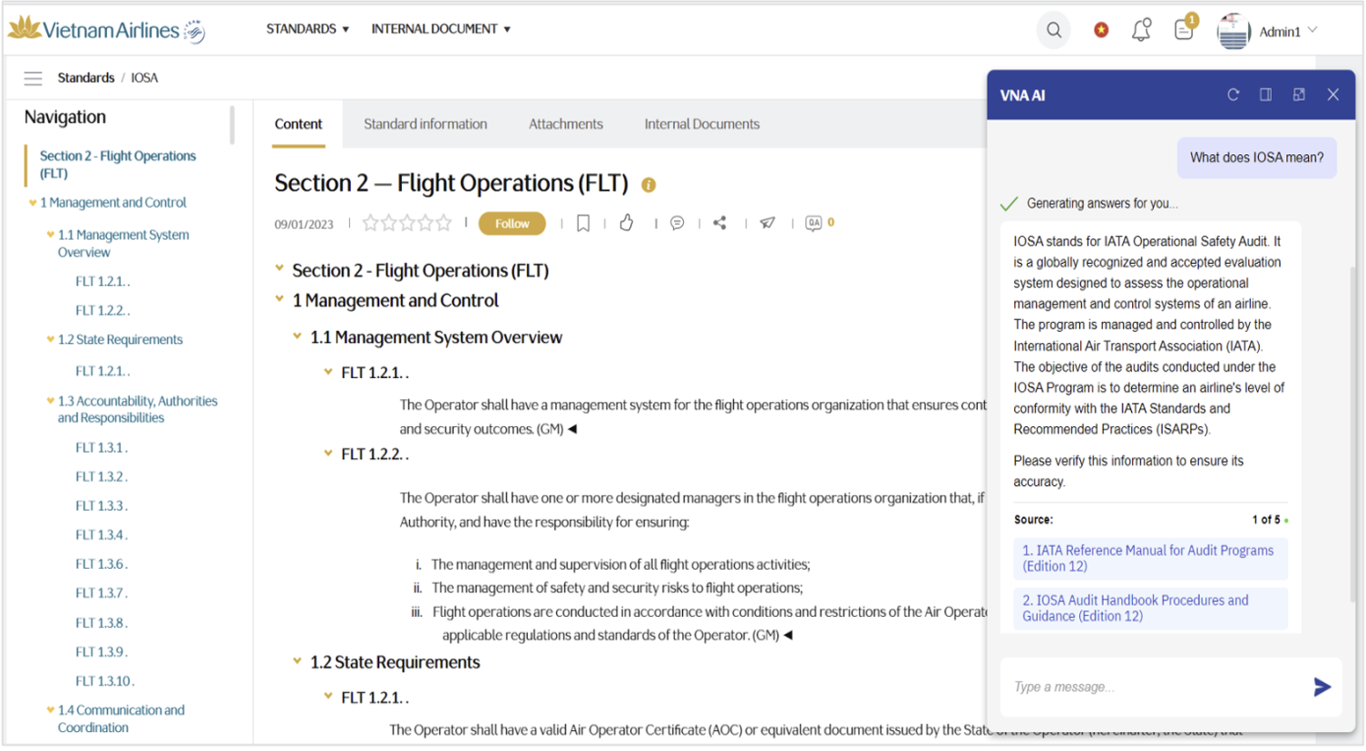 Tra cứu tài liệu trong kho tri thức của VNA: VNA AI cung cấp cho CBNV một cách nhanh chóng và dễ dàng truy cập vào các tài liệu về tiêu chuẩn, quy định của các tổ chức quốc tế, của cục hàng không và các quy định riêng tại VNA được lưu trữ trên hệ thống thư viện số của VNA. Thông qua việc chat với AI, nhân viên có thể truy vấn và nhận được thông tin cần thiết ngay lập tức. Điều này giúp tiết kiệm thời gian và nâng cao hiệu quả công việc.