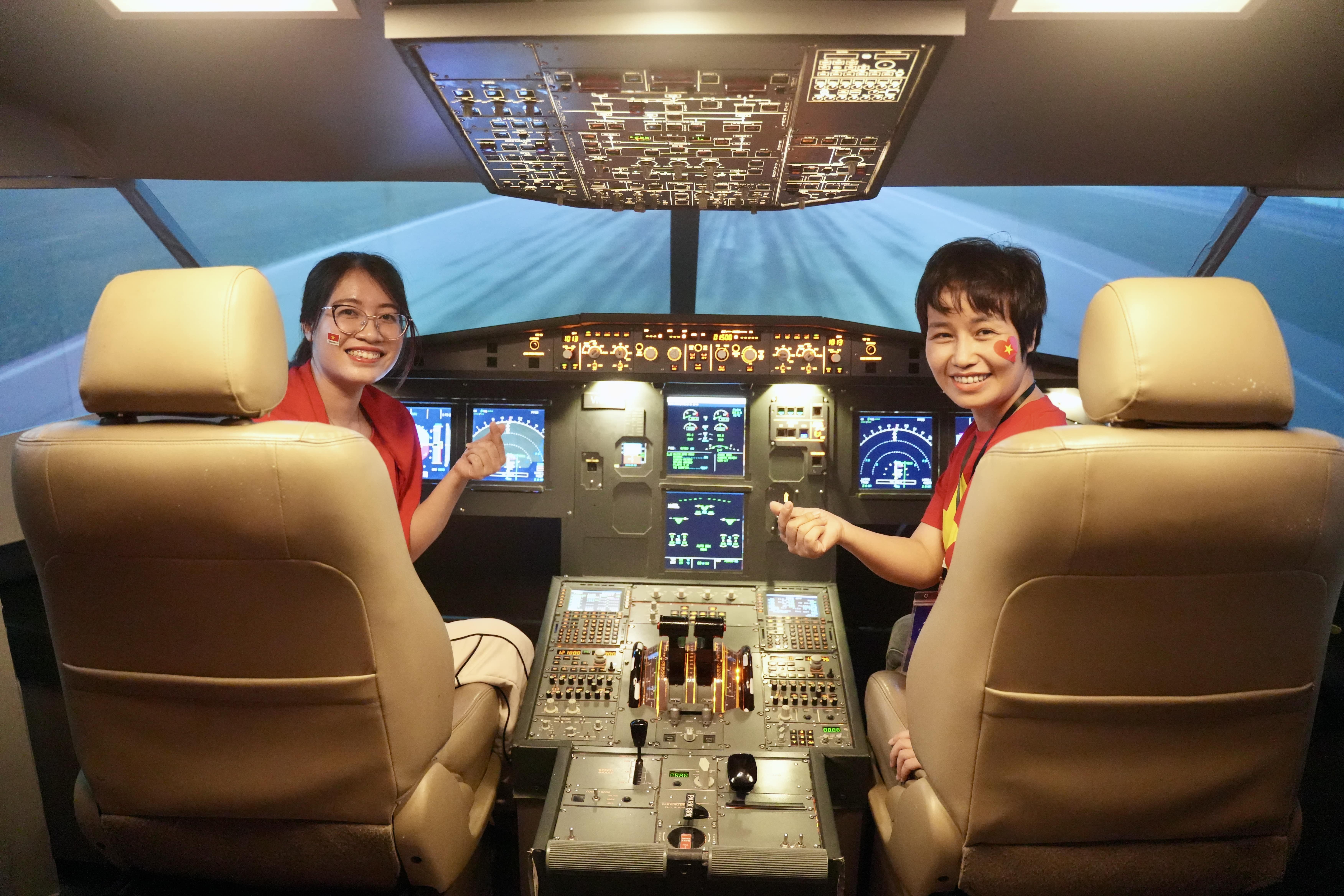 Buồng lái mô phỏng Airbus A320/321 đầu tiên tại miền Bắc, giúp khách tham quan có cơ hội thử cảm giác cất cánh, hạ cánh như một phi công. (Ảnh: VNA)