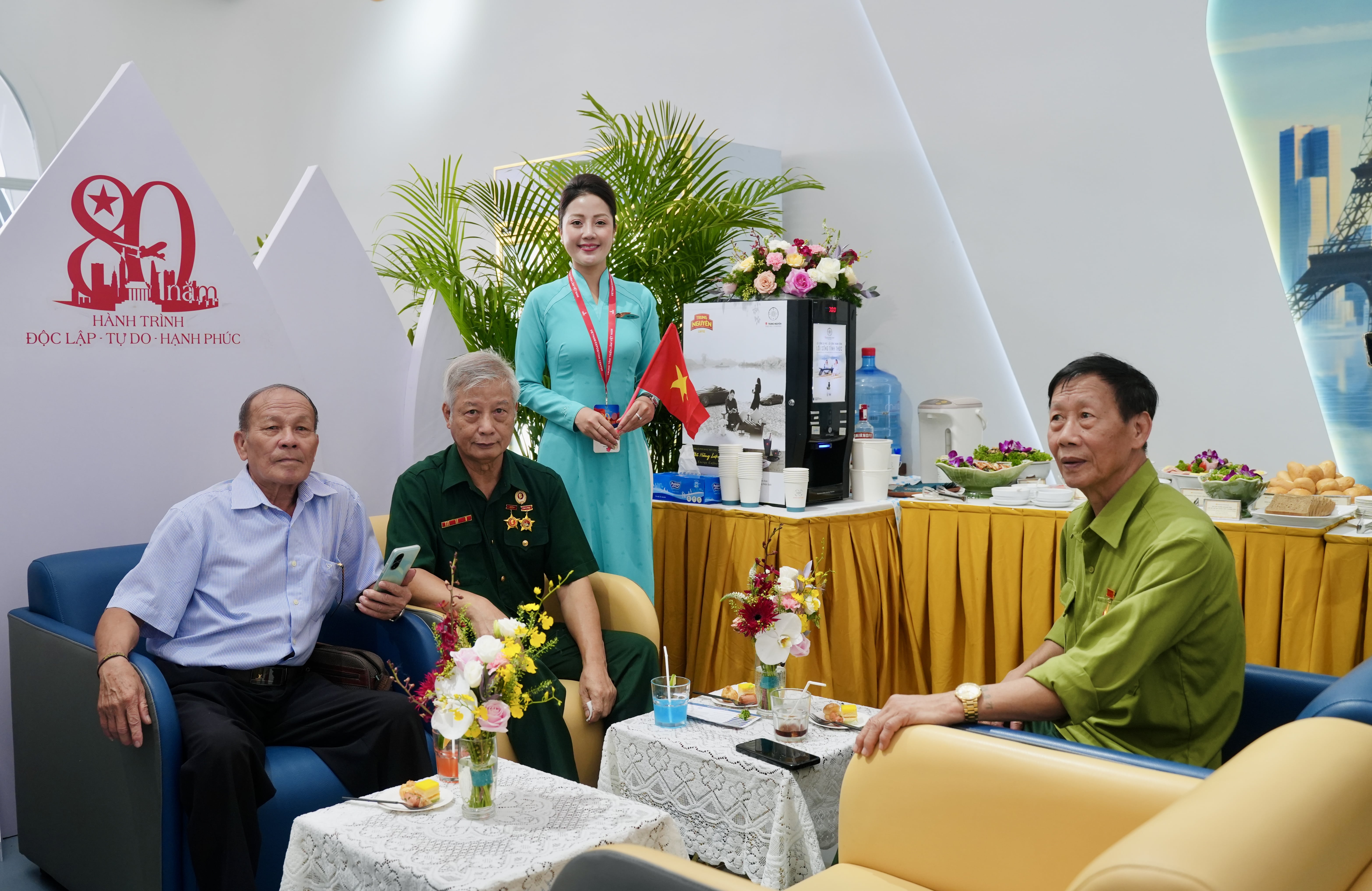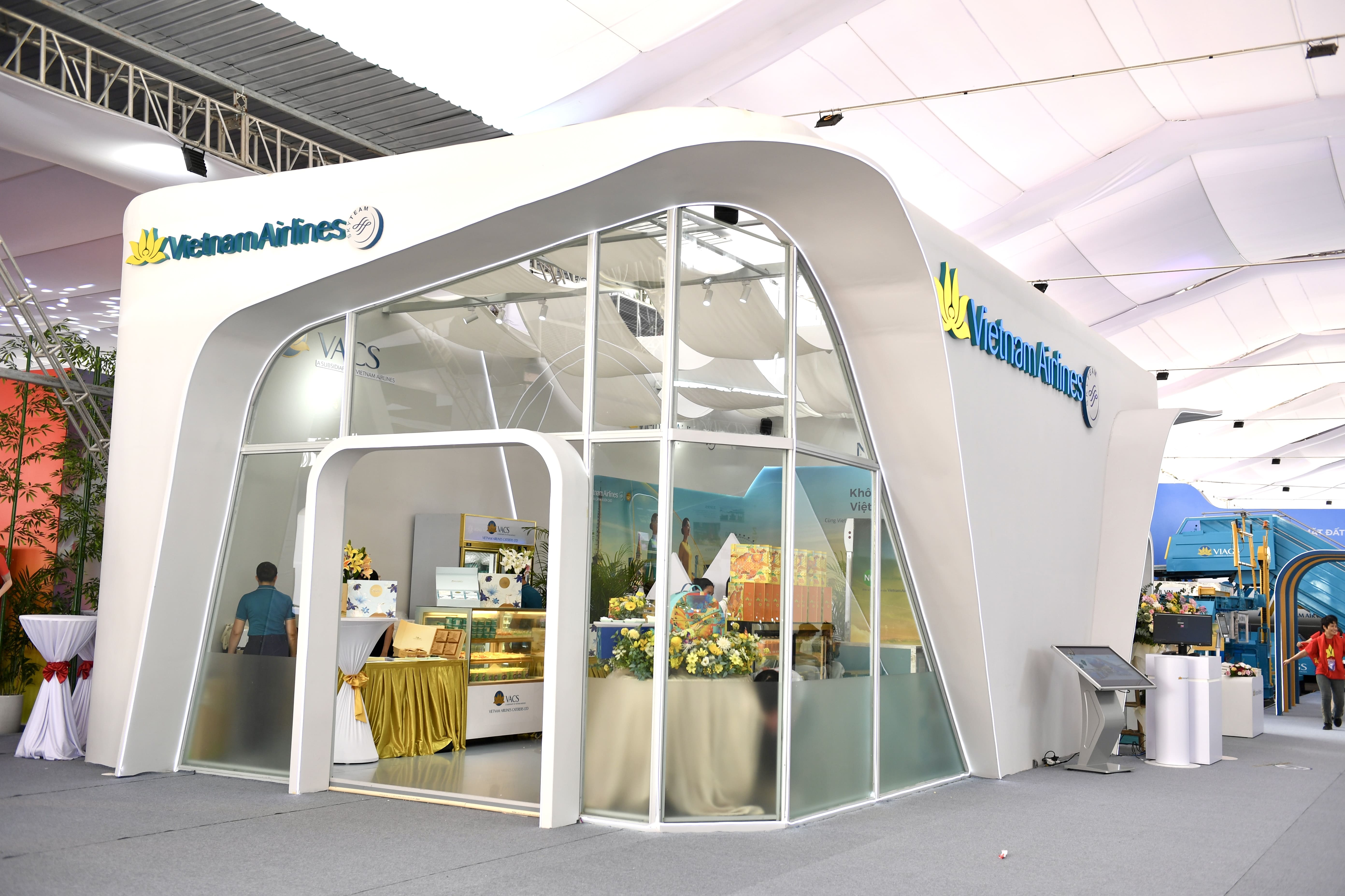 Không gian phòng khách Bông Sen và khu vực giới thiệu suất ăn hàng không tái hiện dịch vụ đẳng cấp của Vietnam Airlines, mang đến cho khách tham quan trải nghiệm dịch vụ trọn vẹn. (Ảnh: VNA)