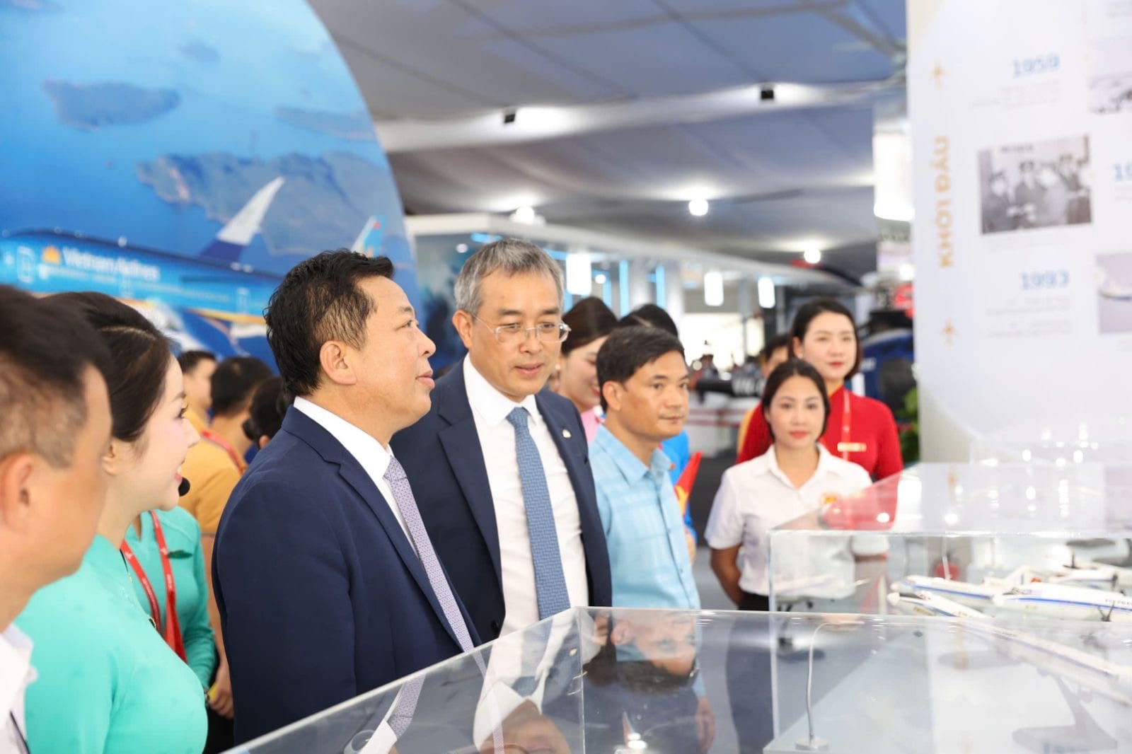 Ông Trần Hồng Minh – Bộ trưởng Bộ Xây Dựng cùng CTHĐQT Đặng Ngọc Hoà tham quan khu triển lãm Vietnam Airlines tại Triển lãm “80 năm hành trình Độc lập – Tự do – Hạnh phúc”. (Ảnh: VNA)