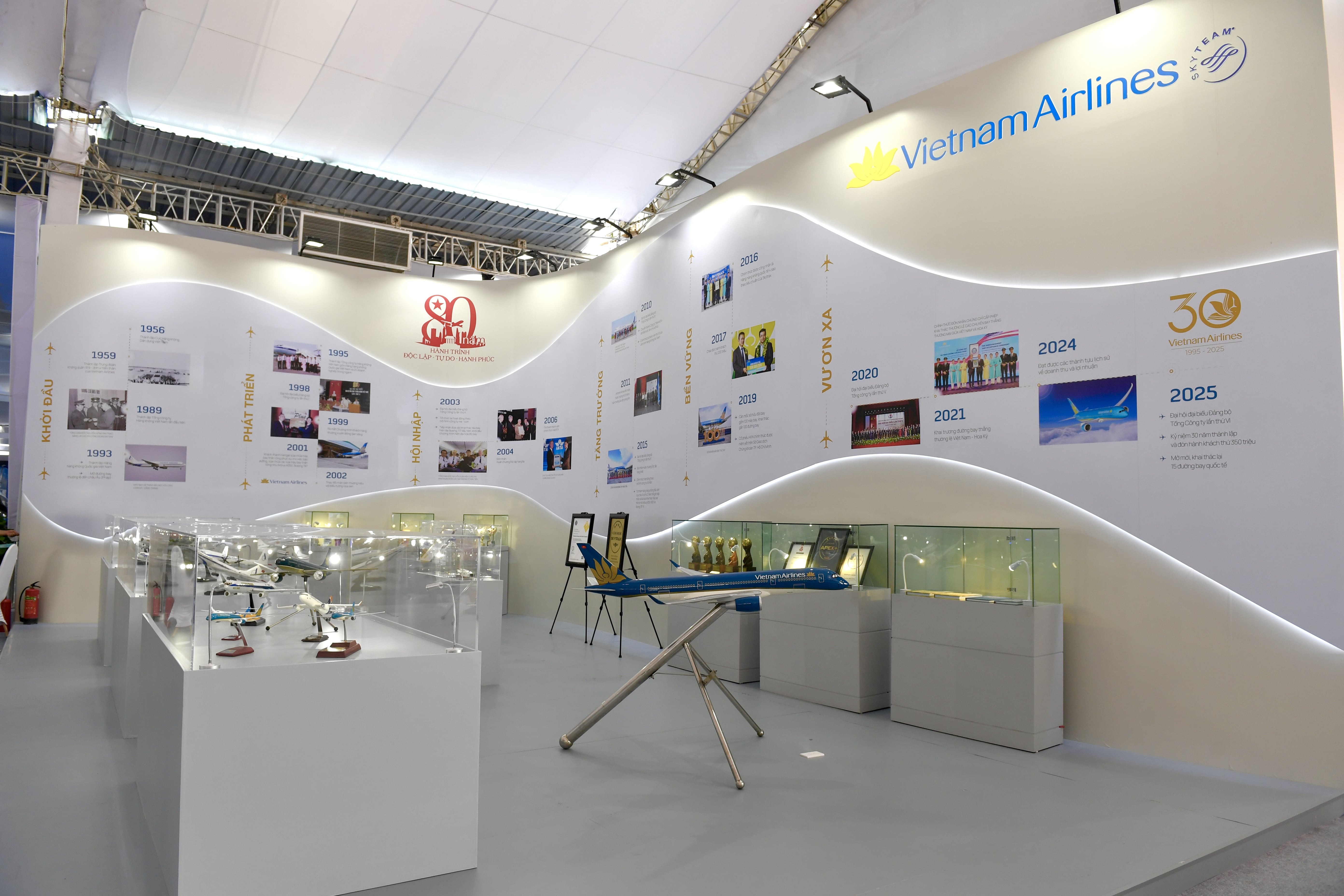 “Vách lịch sử” tái hiện những cột mốc quan trọng trong hành trình của Vietnam Airlines, từ Trung đoàn Không quân 919 – đơn vị Anh hùng, đến vị thế Hãng hàng không Quốc gia hôm nay. Đây là không gian tôn vinh truyền thống, khẳng định sứ mệnh đồng hành cùng sự lớn mạnh của đất nước và khát vọng vươn xa trong tương lai. (Ảnh: VNA)
