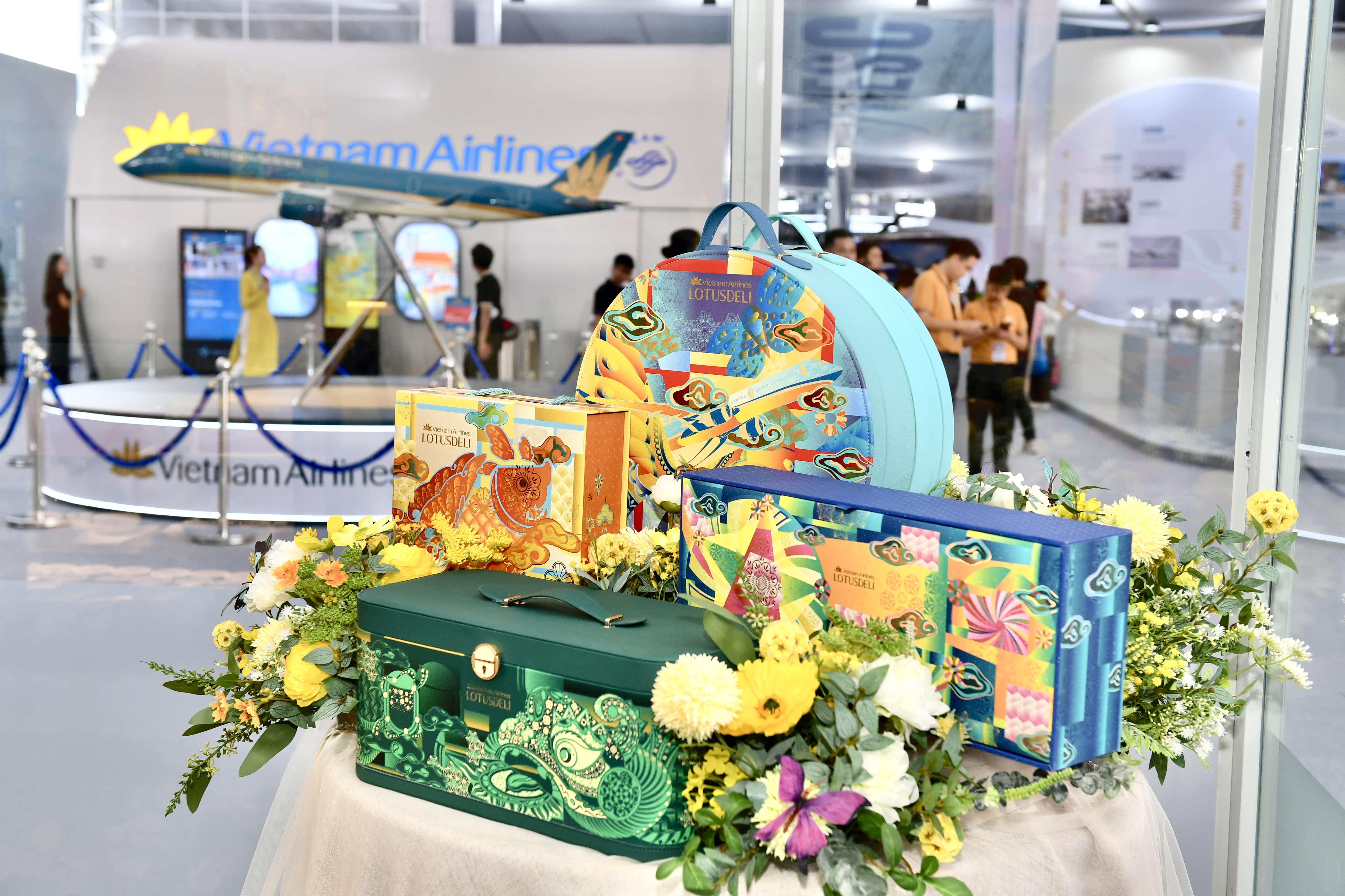 Các mẫu bánh Trung thu Lotus Deli được trưng bày tại triển lãm, giới thiệu hương vị tinh tế mang dấu ấn riêng của Vietnam Airlines. (Ảnh: VNA)
