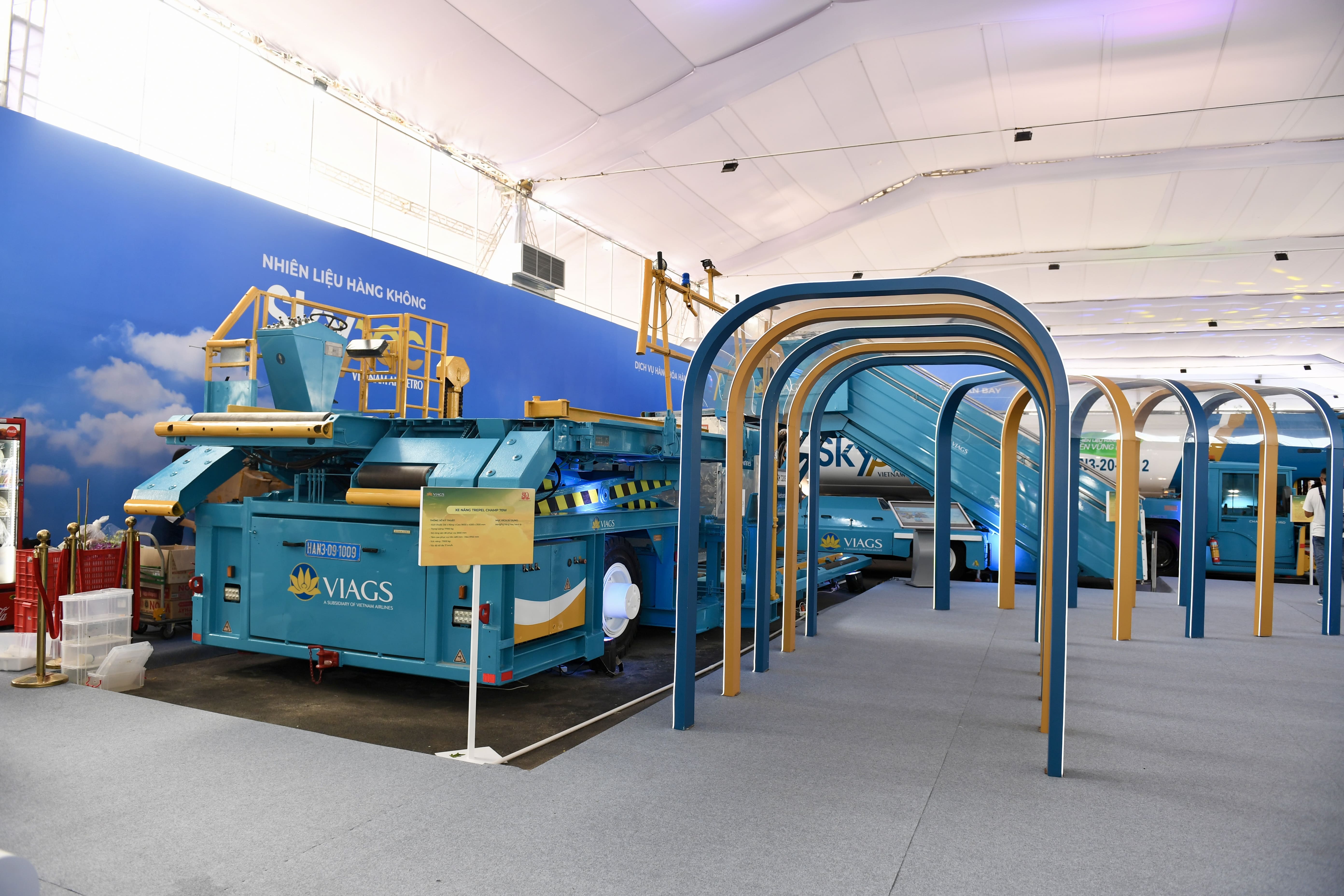 Khu trưng bày trang thiết bị mặt đất và xe tra nạp nhiên liệu đây là khu vực giới thiệu các thiết bị phục vụ mặt đất như xe thang, xe kéo đẩy máy bay, xe nâng cùng xe tra nạp nhiên liệu SAF. (Ảnh: VNA)