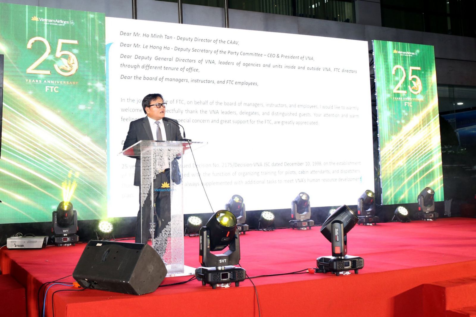 Thay mặt lãnh đạo TCT, TGĐ Lê Hồng Hà chúc mừng TTHLB về những thành tựu trong công tác huấn luyện đào tạo – đóng góp xây dựng giá trị cốt lõi cho VNA, TGĐ trân trọng ghi nhận những đóng góp của toàn thể TTHLB trong suốt 25 năm qua vào sự phát triển của ngôi nhà chung VNA. TGĐ Lê Hồng Hà cũng đã động viên khuyến khích và luôn tin tưởng vào tập thể TTHLB sẽ luôn phấn đấu đạt thêm nhiều thành công hơn nữa.