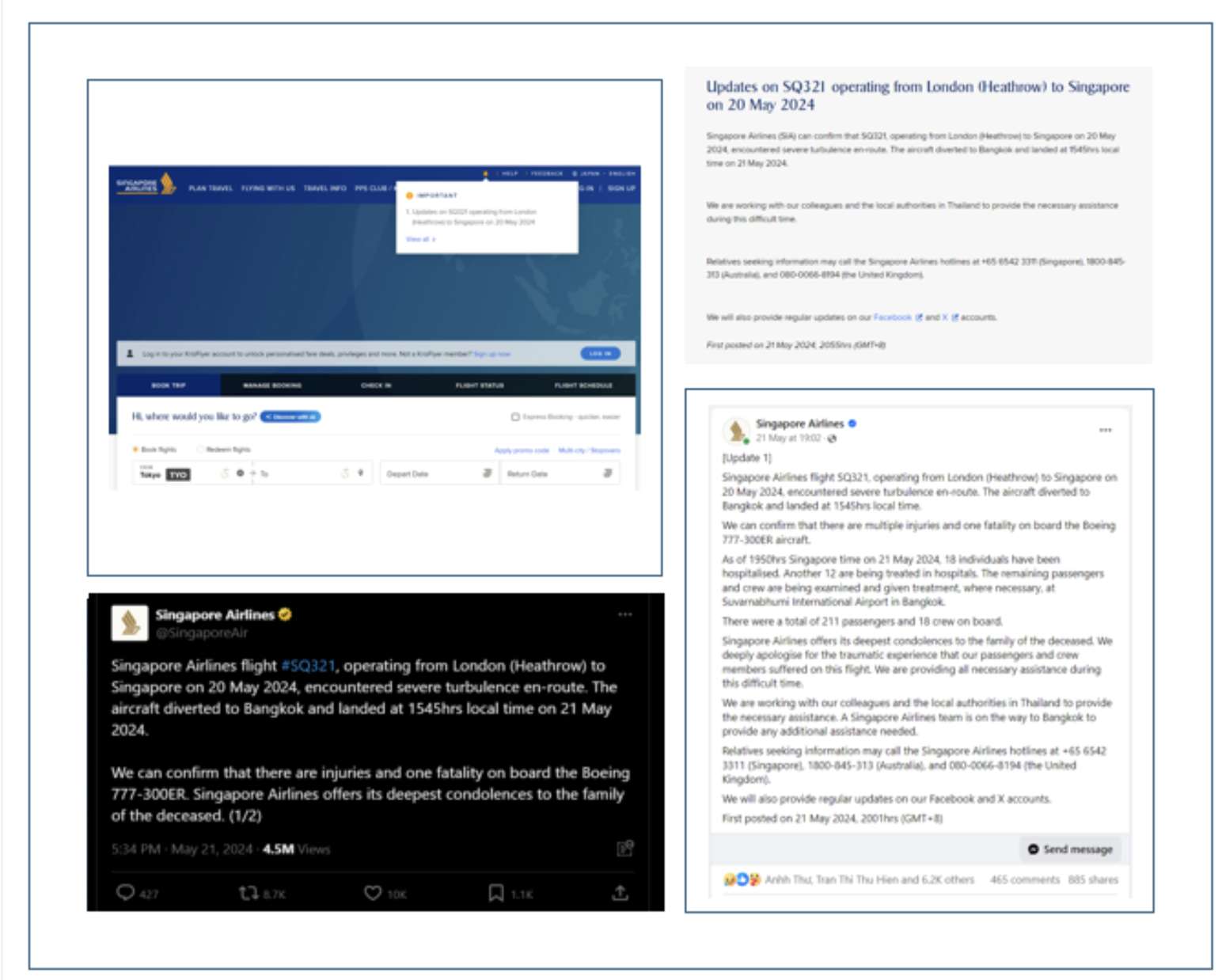 Trước hết, không để giới truyền thông, thân nhân và hành khách phải chờ đợi lâu, Singapore Airlines đã đăng tải Thông báo đầu tiên về sự cố trên facebook của hãng lúc 19h01, tức là khoảng 3,5 tiếng sau khi SQ321 đáp khẩn cấp xuống Bangkok (16h45 ngày 21/5 – mốc này sau đây gọi là “T”). 30 phút sau đó, có thêm một Thông báo đầu tiên trên trang web của hãng, và nối tiếp sau đó là trên mạng xã hội X. Cũng kể từ Thông báo đầu tiên, các banner quảng cáo trên trang web tạm dừng, các bài viết quảng cáo truyền thông trên mạng xã hội của Singapore Airlines cũng không xuất hiện nữa.