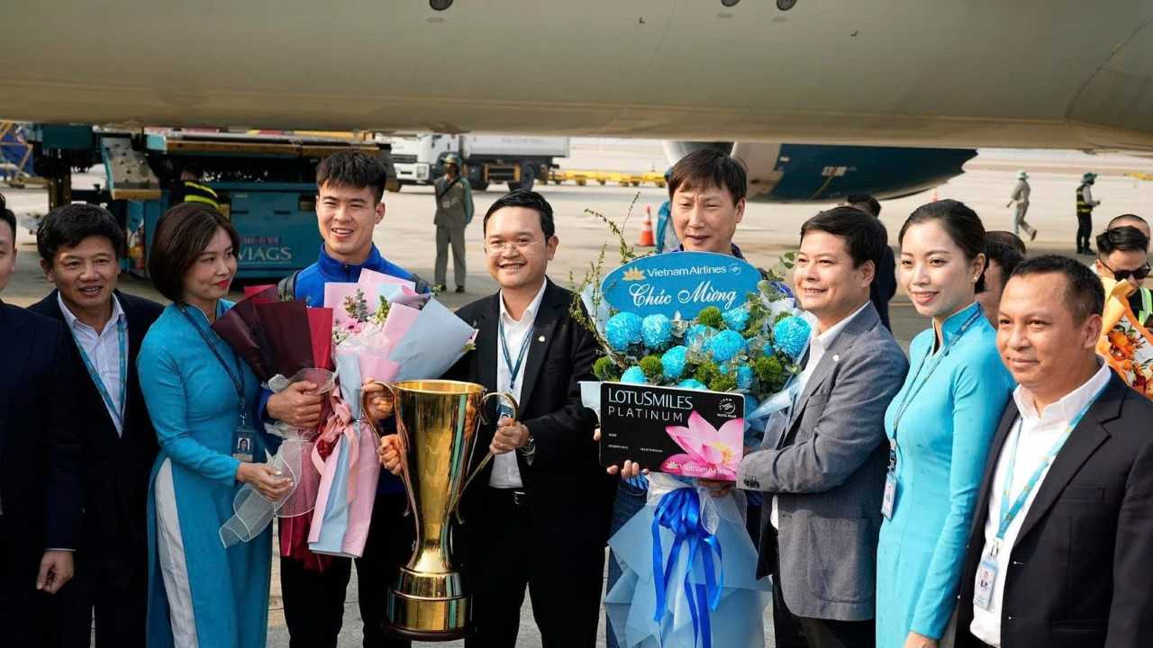 Trở về từ Bangkok trên chuyến bay VN610 của Vietnam Airlines (VNA), các chiến binh sao vàng đã mang theo niềm tự hào lớn lao về cho Tổ quốc. Hàng ngàn băng rôn, khẩu hiệu chúc mừng hòa cùng tiếng hò reo của người hâm mộ đã tạo nên một không khí lễ hội sôi động tại Sân bay Nội Bài của ngày đầu năm 2025.