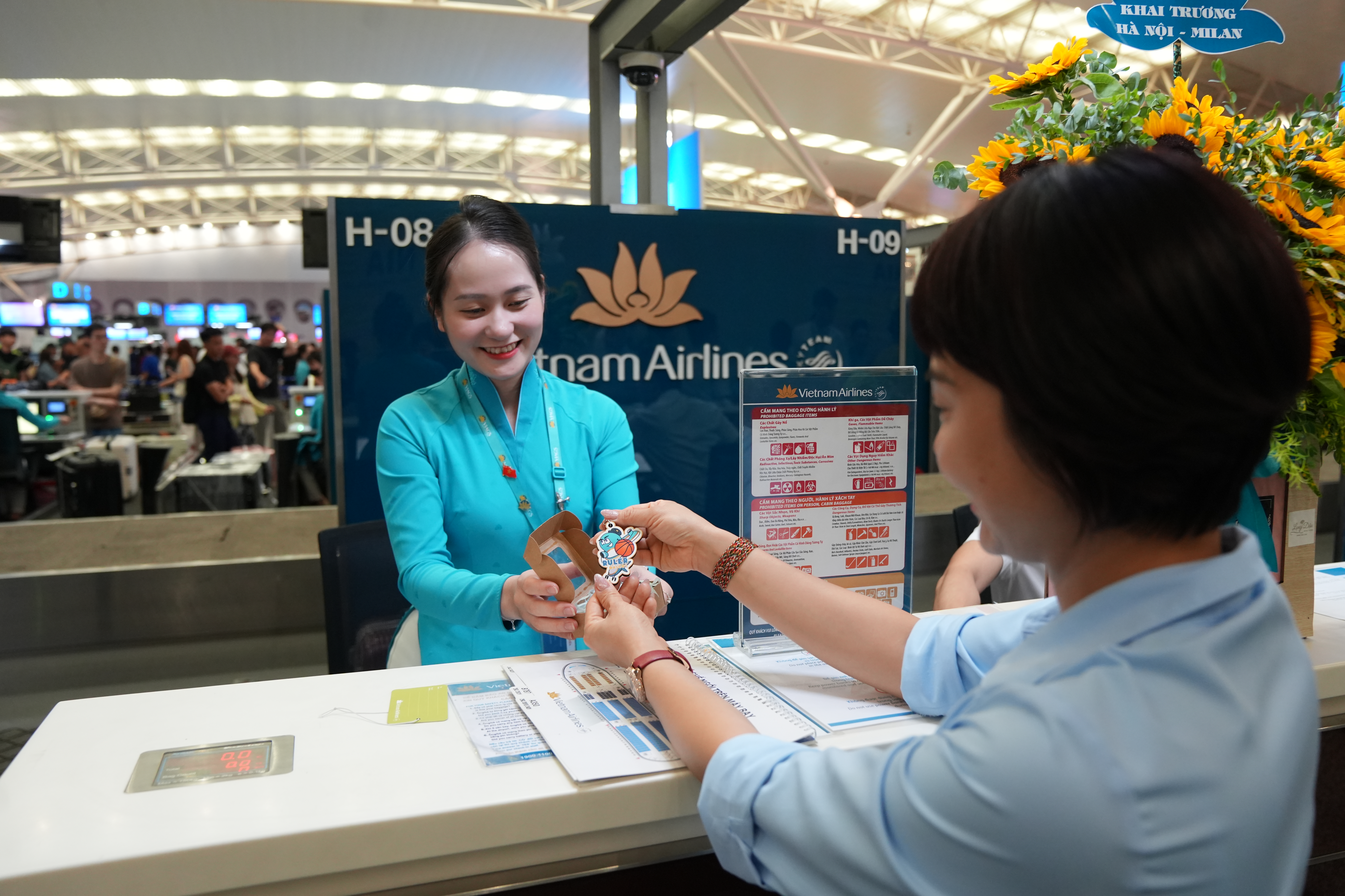 Hành khách chuyến bay khai trương Hà Nội – Milan làm thủ tục tại quầy checkin. (Ảnh: VNA)
