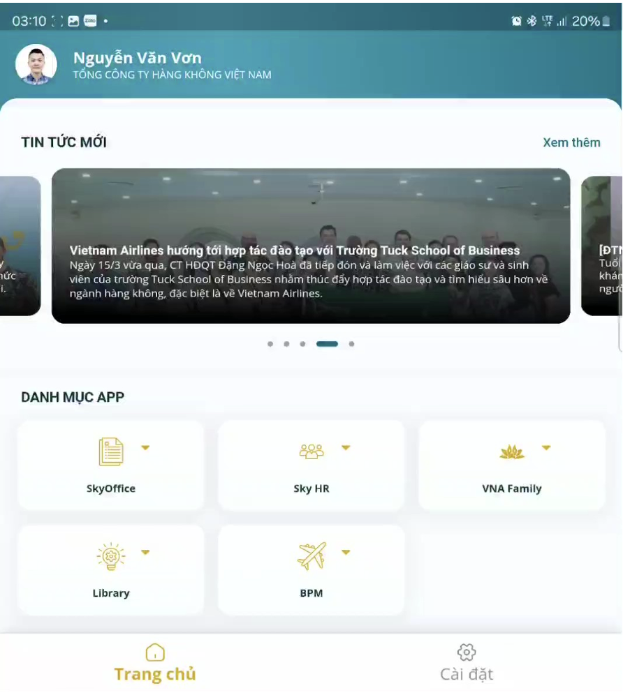 - Phân hệ quản lý nhân sự (SkyHR) được tích hợp một số tính năng liên quan đến đến công tác quản lý nhân sự, cung cấp cho các CBNV khả năng tra cứu thông tin cá nhân, cho phép CBNV xem, quản lý và theo dõi thu nhập cá nhân một cách hiệu quả, cho phép CBNV đăng ký và quản lý các đợt nghỉ phép, tạo sự linh hoạt trong lịch làm việc. CBNV cũng có thể dùng danh thiếp điện tử trên ứng dụng gửi tới đối tác để thực hiện quét mã QR danh thiếp, ngay lập tức thông tin của CBNV sẽ được lưu vào điện thoại của đối tác.
