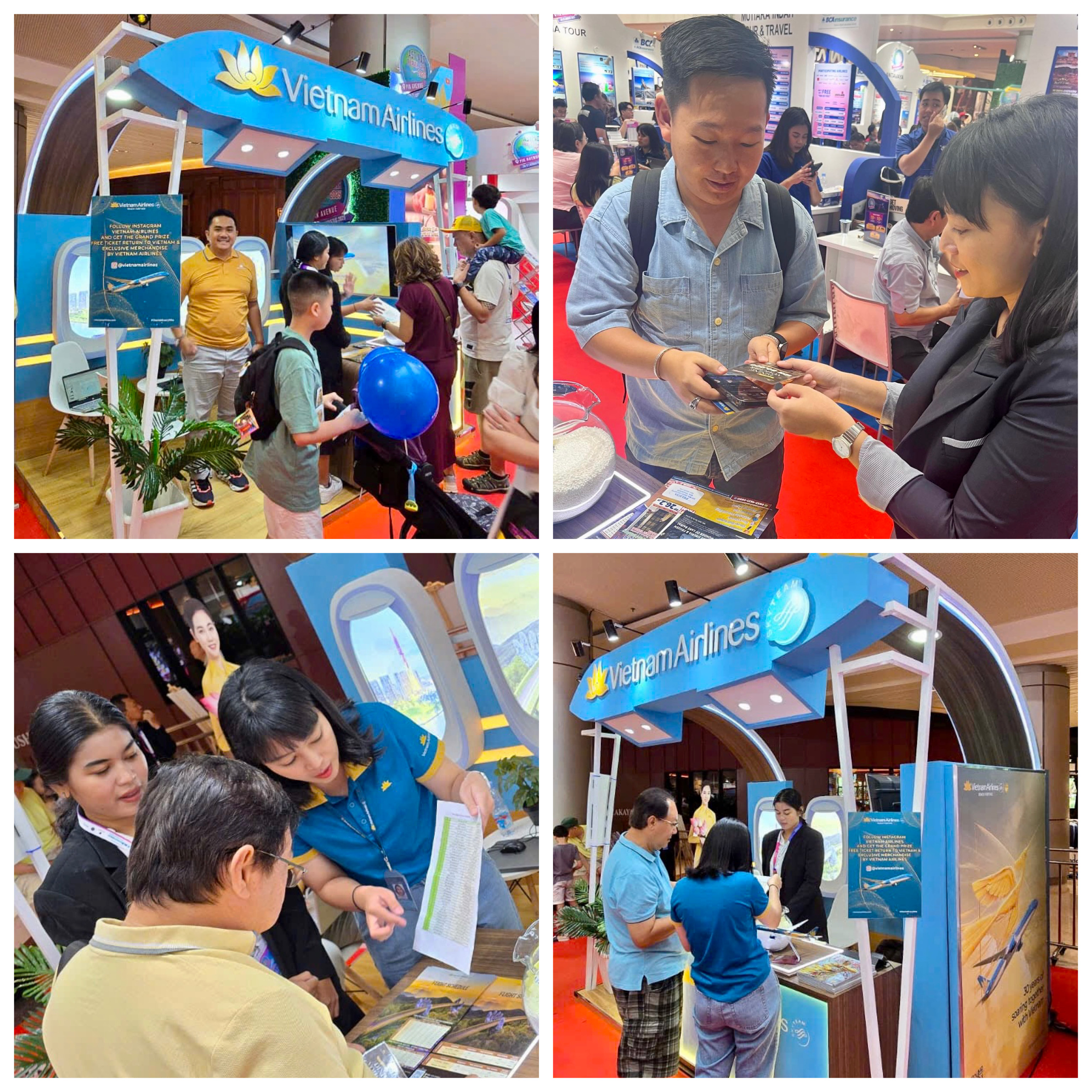 Tại hội chợ, gian hàng Vietnam Airlines được thiết kế mang đậm dấu ấn thương hiệu với hình ảnh hoa sen vàng, mô phỏng cửa sổ máy bay và trưng bày nhiều sản phẩm dịch vụ đặc trưng. Hãng giới thiệu đến khách tham quan các đường bay kết nối Việt Nam – Indonesia, các hành trình khám phá di sản, biển đảo, nghỉ dưỡng cũng như trải nghiệm dịch vụ hàng không chuẩn 5 sao quốc tế.