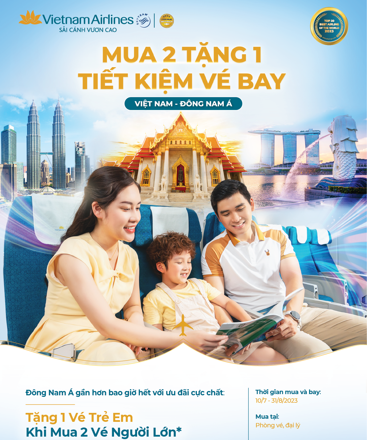 Trên đường bay Đông Nam Á, từ nay đến ngày 31/8/2023, Vietnam Airlines triển khai chương trình Mua 2 tặng 1 cực kì hấp dẫn. Cụ thể khi khách hàng mua 2 vé máy bay khứ hồi người lớn hạng Phổ thông linh hoạt và Phổ thông tiêu chuẩn sẽ được tặng 1 vé máy bay khứ hồi trẻ em cùng hành trình.