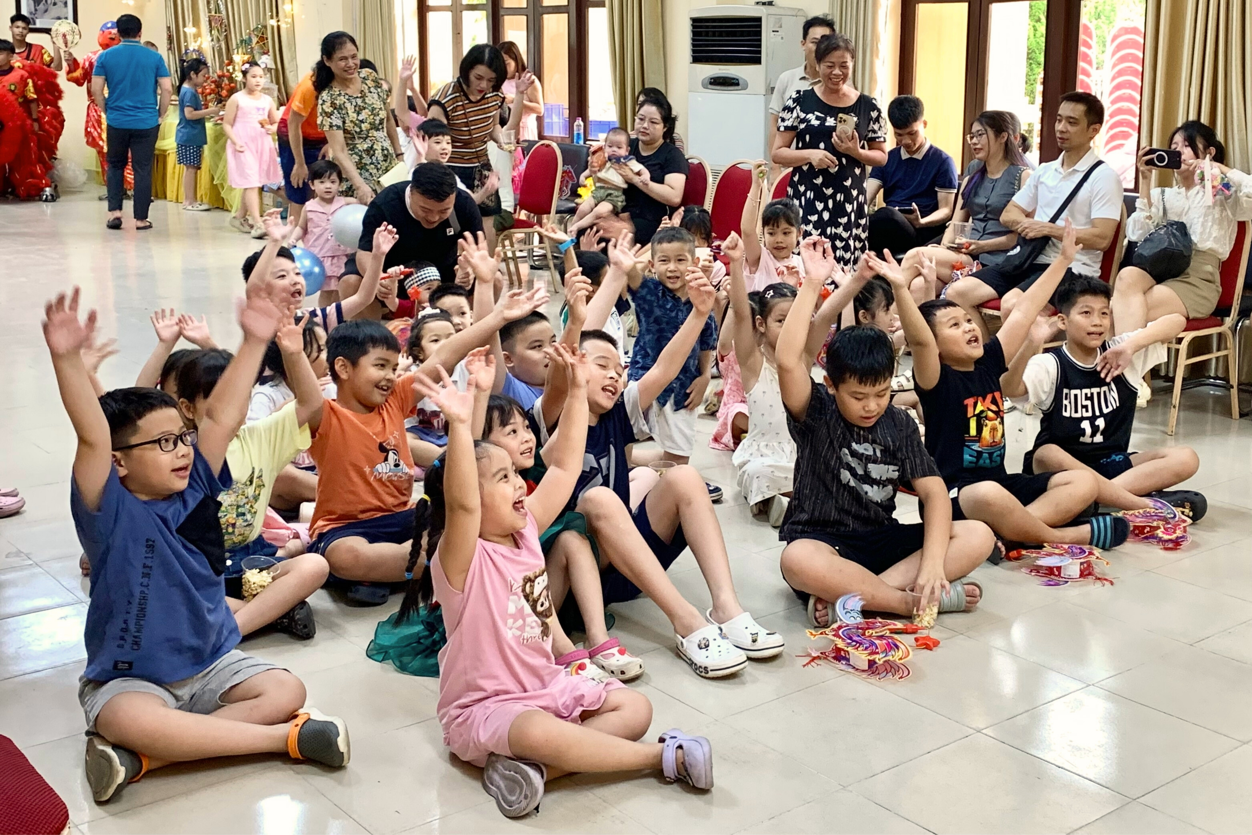 Tại phía Bắc, các em đã có một buổi chiều tràn ngập niềm vui với những tiết mục văn nghệ “cây nhà lá vườn” do chính con em cán bộ trình diễn, những trò chơi tương tác, ảo thuật và các góc trải nghiệm đầy màu sắc. Trong tiếng nhạc rộn ràng, những khuôn mặt rạng rỡ, ánh mắt tròn xoe dõi theo từng tiết mục ảo thuật đầy bất ngờ là hình ảnh đáng yêu nhất của ngày hội. Xen giữa chương trình, các em cùng thưởng thức tiệc nhẹ ấm cúng – vừa ăn, vừa cười, vừa háo hức chờ đến lượt mình tham gia các phần chơi tiếp theo, tạo nên một không gian gia đình thân mật và chan hòa. Chính những hoạt động này đã giúp các em tự tin thể hiện bản thân, đồng thời vun đắp tinh thần đoàn kết và sẻ chia.
