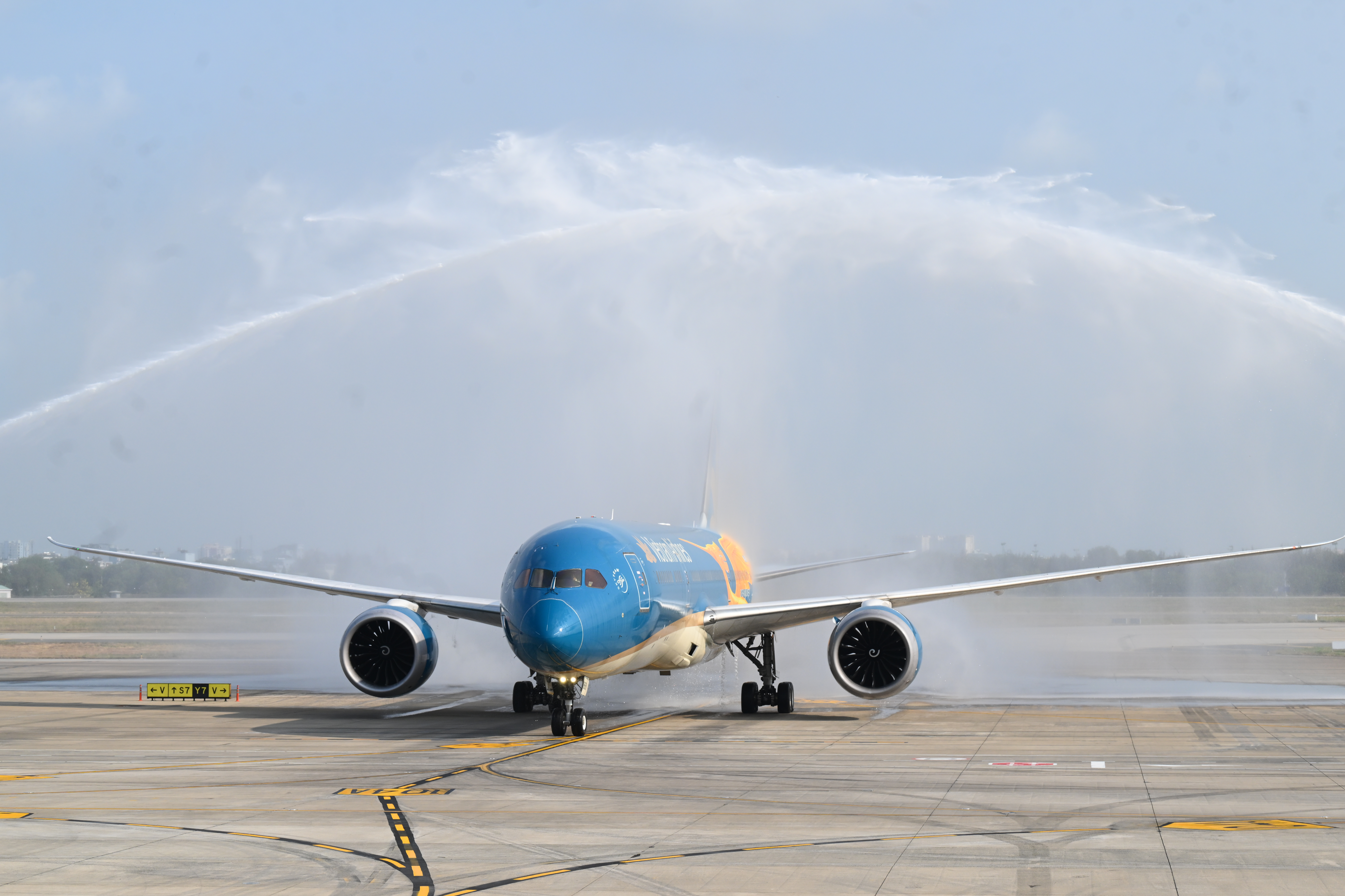 Trước đó, lúc 8h00 cùng ngày, chuyến bay VN243 từ Hà Nội do Vietnam Airlines khai thác, cũng bằng chính chiếc Boeing 787 mang hình ảnh Chim Lạc, đã hạ cánh tại TP. Hồ Chí Minh, trở thành chuyến bay thương mại đầu tiên đến và sử dụng nhà ga T3. Máy bay được chào đón trang trọng bằng nghi thức phun vòi rồng – truyền thống trong ngành hàng không dành cho những chuyến bay mang dấu mốc đặc biệt.