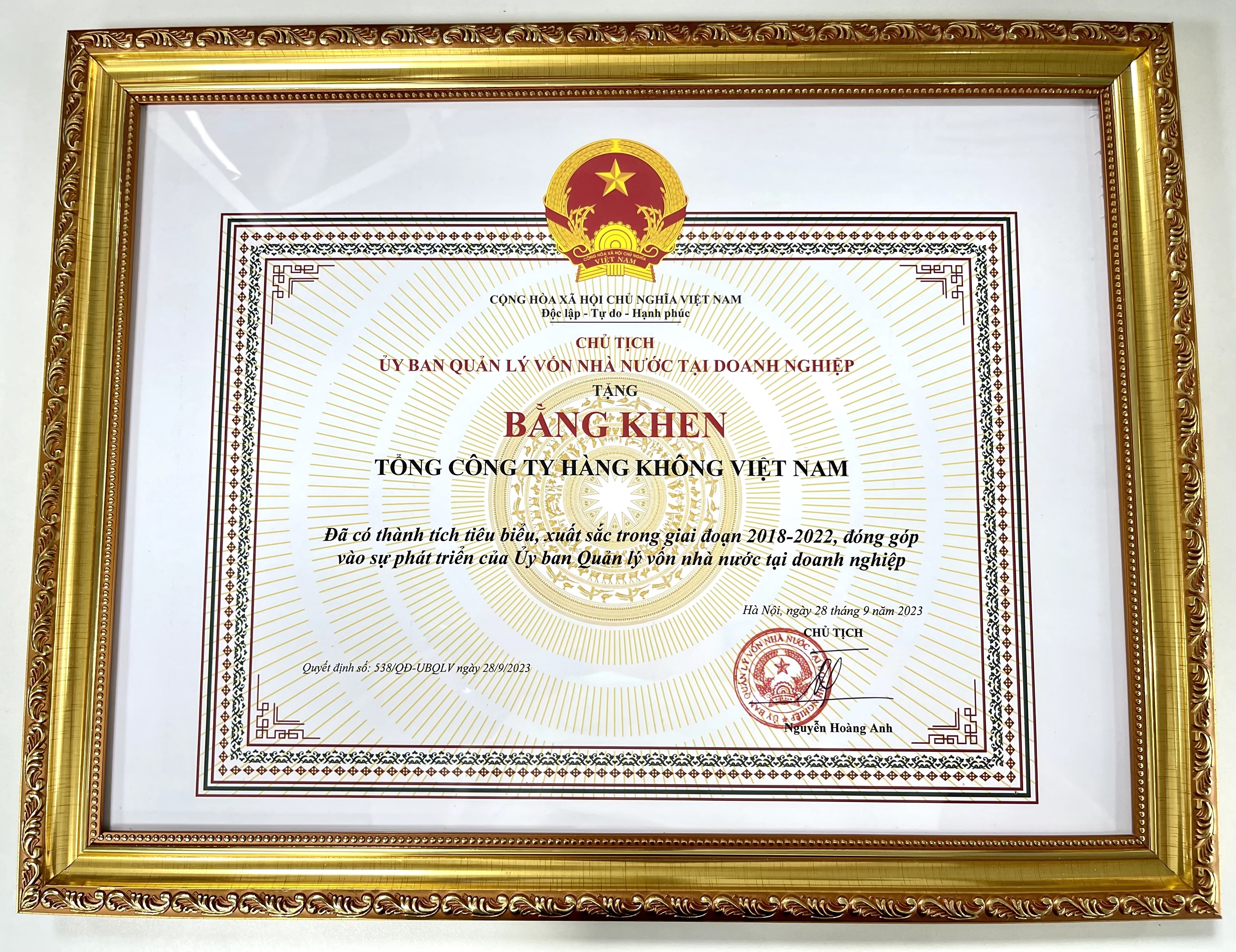 Phần thưởng cao quý của Uỷ ban Quản lý vốn nhà nước (UBQLV) này đã khẳng định vai trò chủ đạo trong vận tải hàng không của Vietnam Airlines, kinh doanh có hiệu quả, hoàn thành tốt các nhiệm vụ chính trị do Đảng và Nhà nước giao, góp phần tích cực vào sự phát triển của Uỷ ban.